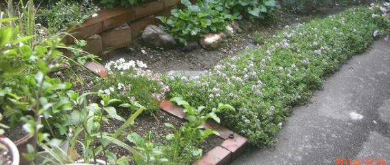 花が満開のタイムの芝 大きくなっているハーブ達 |