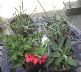 | 日野春ハーブガーデンから第2団の苗が届きました。 私が、夢見たミセス・ティラーの赤花が目の前・・・嬉しい! コモンセージとラベンダーです |