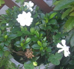 枯れるかと心配したクチナシが、 やっと咲いてくれました 玄関先の隅で咲いています |