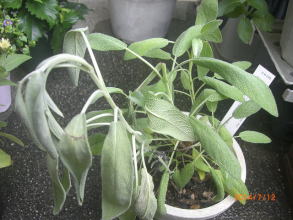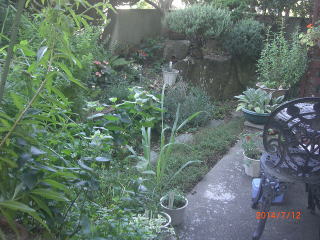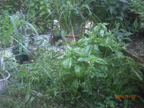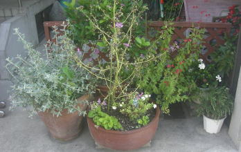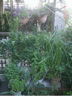 整然としていた棚ですが、どこがどうなってるか?状態 大きく伸びているのが、レモンバーベナ 花を付けているのが、太葉ミントとオレガノ ミント類は、なんとかおとなしくしています 吊るしたペチュニアもなんかあぶなっかそう・・・ レモングラスのように見えるのは、昔、紙の原料にした物 セージが、危ない! |