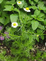 今年、庭の片隅にジャーマン・カモミール苗が出ていてビックリ