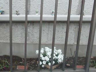 門中央の丸鉢中央のアップ写真です 小さな花ですが、こうやって見ると、とっても可愛い 薄紫色が、白色とマッチして素敵な色合い |