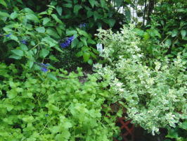 地植えのアップルミントとパインナプルミント・パープルセージ、バラが入りこんで、下の植物が見えません