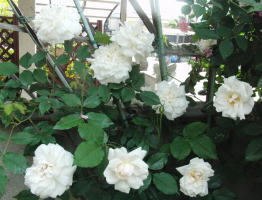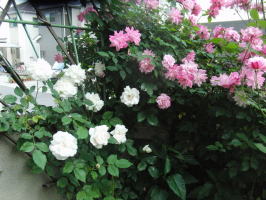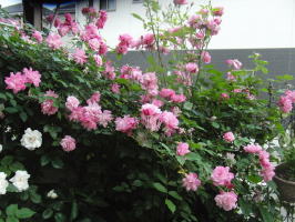 去年植えたつるバラの白が入って賑やかです