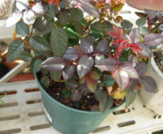 | ミニバラの葉の色が 素敵な深紅になったのでパチリ 肥料の性か、みんな勢いが良いです |