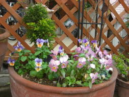 玄関わきのトリリスの前には、私の好きな薄紫色を中心に、ビオラを