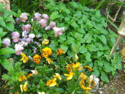 左は、右側の「レモンバーム」を囲む形に成長したビオラ
