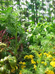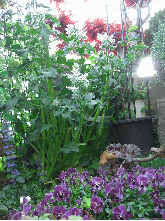 ボリジにビオラ・ジャーマンカモミール・オタフクナンテン・その後ろはレモンバーム