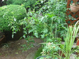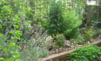 庭のワダソウとレモンバームが大きく中央で育っています