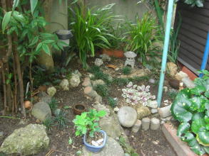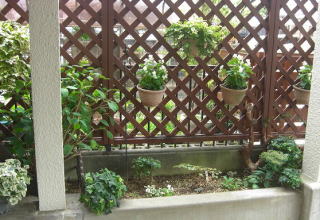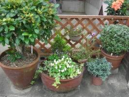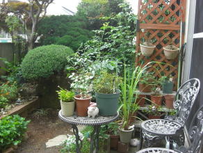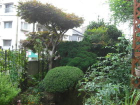 | 左は、木類 イチョウの手入れができていません 秋は、葉が散って、大変だろうな イチョウの下のローズアリー 大きくあらないように常に刈り込んでいます その横が、6本程、プランターに入れたミニトマト 奥が南天・金木犀 雑然としていますが、よく鳥が遊んでいます |