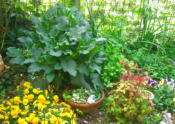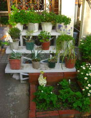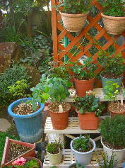| 東側の棚(ハーブ中心) 冬越しを家でしていた子も乗っています 上段はミント3種とオレガノ 下段は、チャービル・レモングラス等々 |