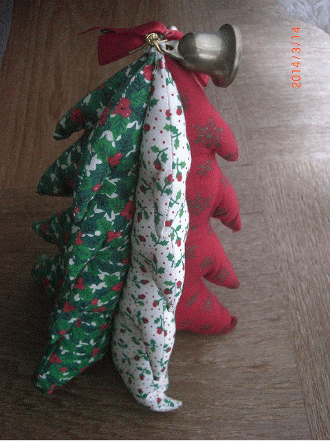 クッリスマスにちなんだ柄の布を3枚選んで、キルト風に綿とポプリを入れ、真ん中で、縫い合わせます。 ちょっと綿の入れ方が下手だったので、傾き加減ですが、本当は、もっと可愛いんですよ(^^;