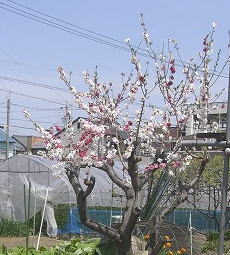 畑の一隅に赤と白が、同じ木に咲いているのを見つけました