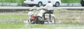 苗を植える機械で、作業する人