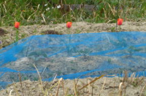 青の網の上に整列したように、チュウリップの赤い花が見えます