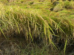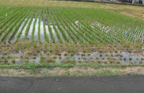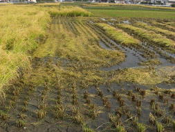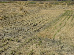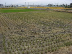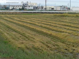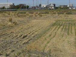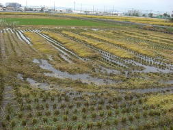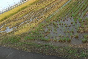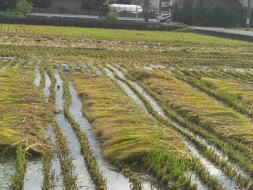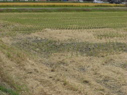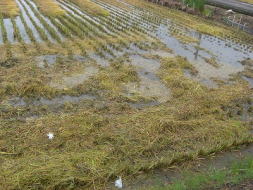 右側は、刈り取った稲はそのままですが、地面の傾斜が高い方なので、水が残っていません