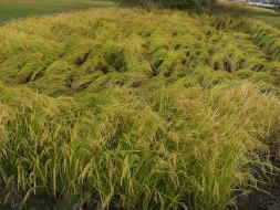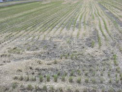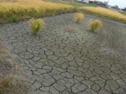 | 田は乾燥してひび割れているのに?? 3か所、稲がまとまって生えています 一体、これは何なんでしょう |