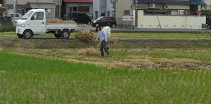 稲刈り後のワラを束ねながら、自動車に載せていらっしゃる農家の方
