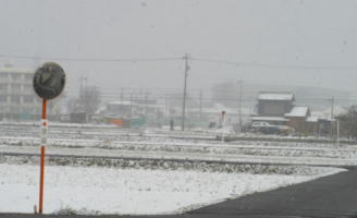 アスファルトの道路は、もう雪が溶けていますが、田んぼは真っ白