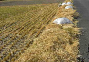 ここの田は、ワラとワラくずが、道路側に積まれている状態