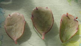枯れそうな葉を取って、挿し芽にしたのですが、取った葉を机の上に並べて置いたら???